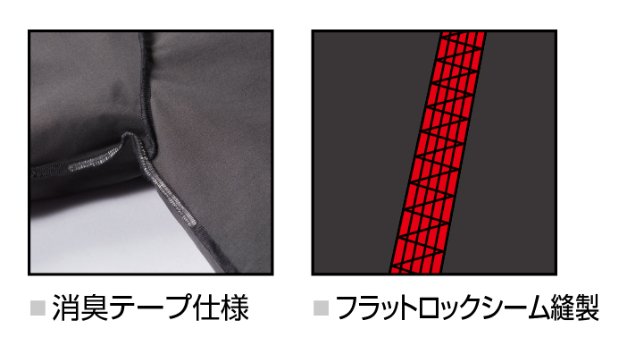 ★フラットロックシーム縫製と消臭テープの機能性が着用時の不快感を軽減