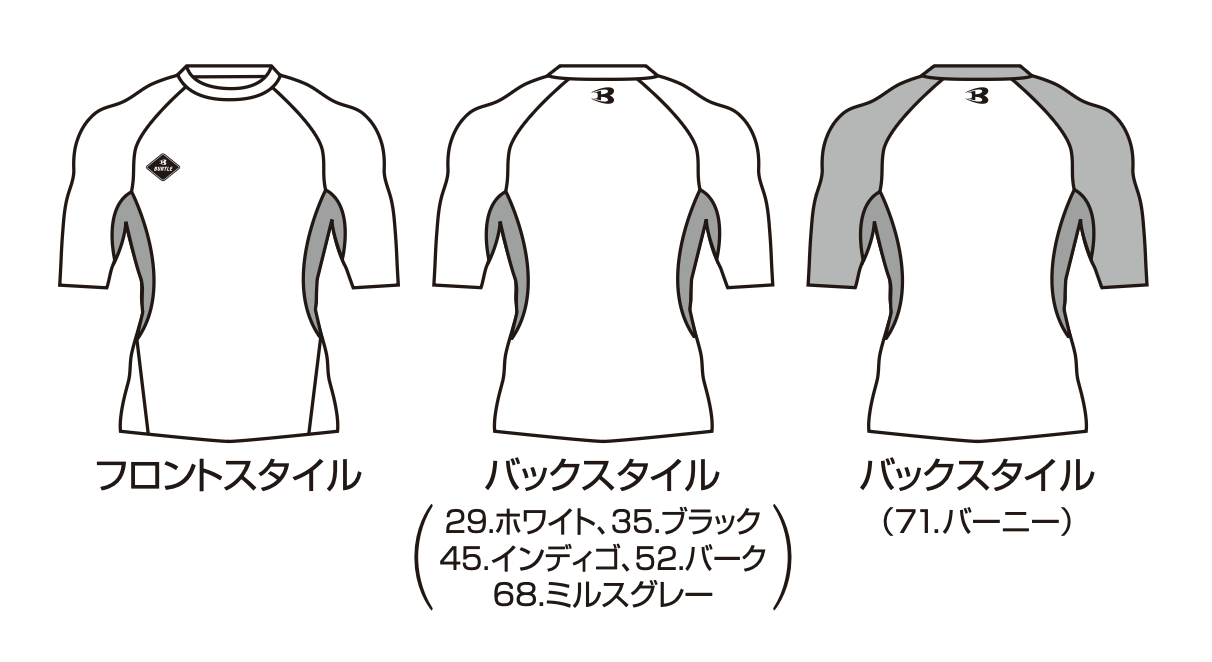 カラー(全6色)/29.ホワイト 35.ブラック 45.インディゴ 52.バーク(杢) 68.ミルスグレー 71.バーニー