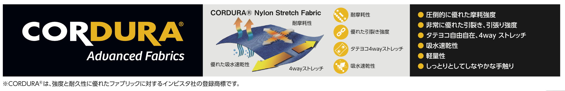★耐久性と自在に伸縮する4WAYストレッチの特性を有するハードユースに最適なコーデュラ素材を使用