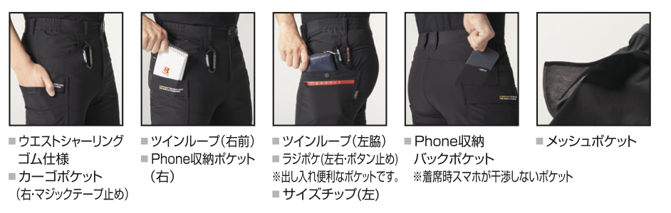 ハードユースに適した高耐久ストレッチ CORDURA素材をモノトーンなデザインにまとめ、都会的なワークウェアの雰囲気に