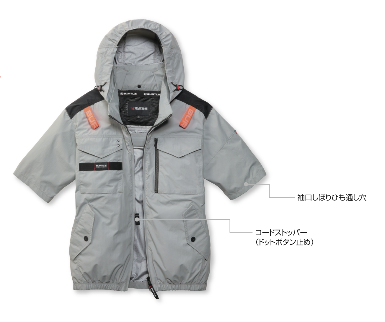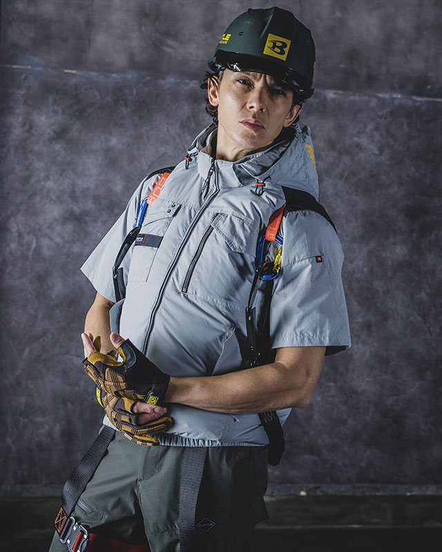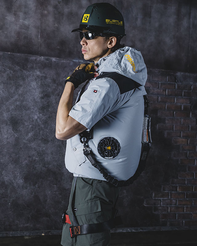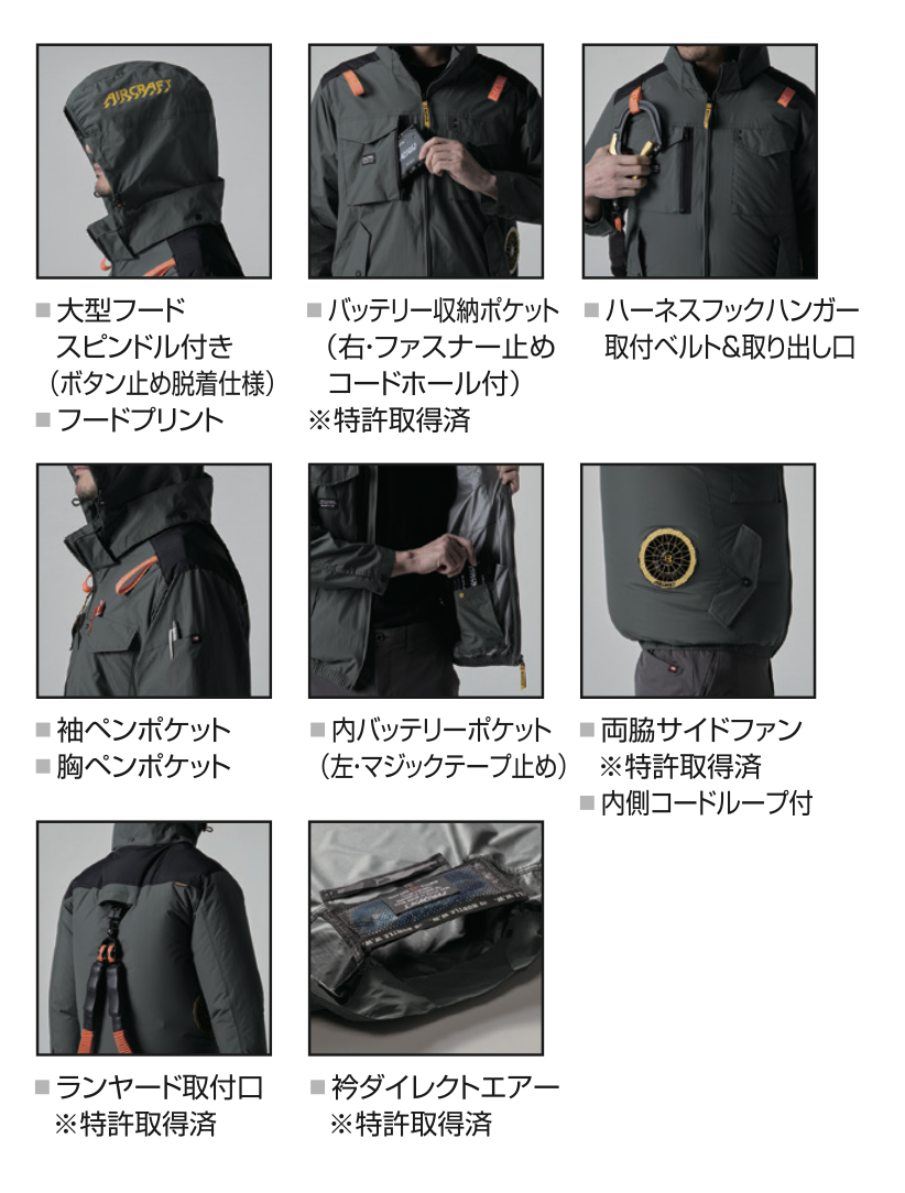 ★ヘルメット収納フード(着脱可能)、フックハンガー、背ランヤードホールを配備しフルハーネスに完全対応