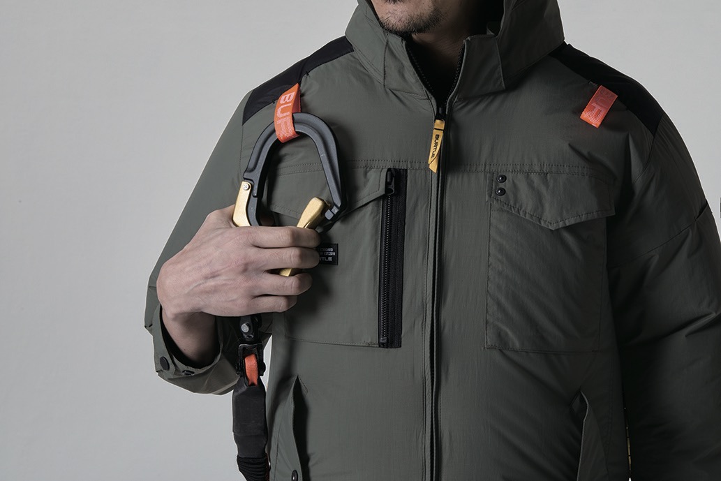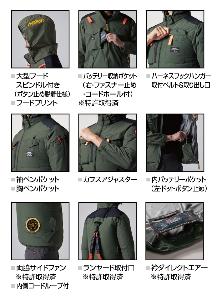 ★ヘルメット収納フード(着脱可能)、フックハンガー、背ランヤードホールを配備しフルハーネスに完全対応