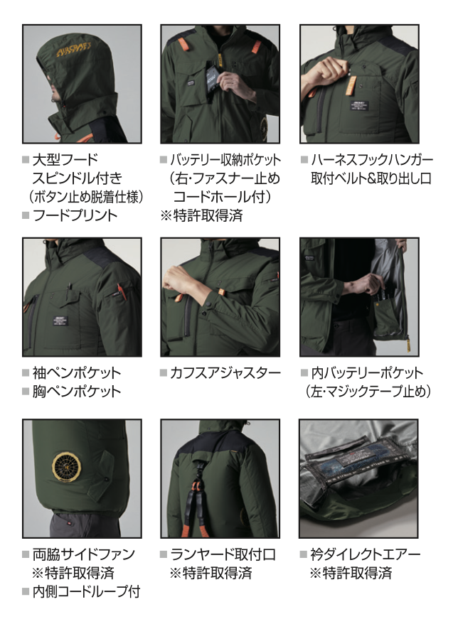 ★ヘルメット収納フード(着脱可能)、フックハンガー、背ランヤードホールを配備しフルハーネスに完全対応