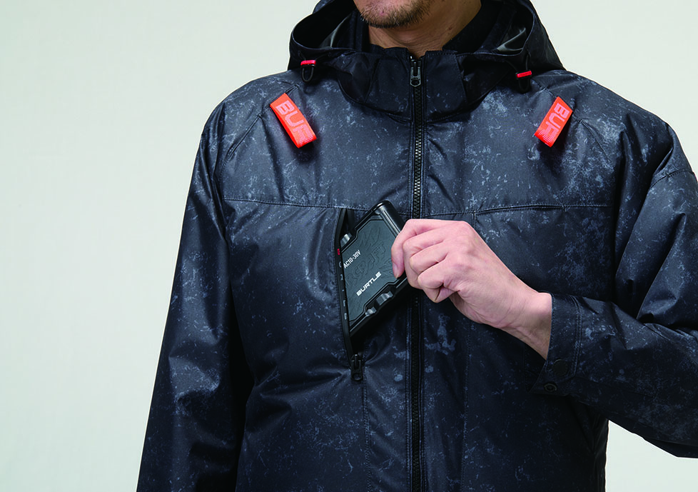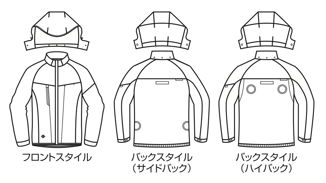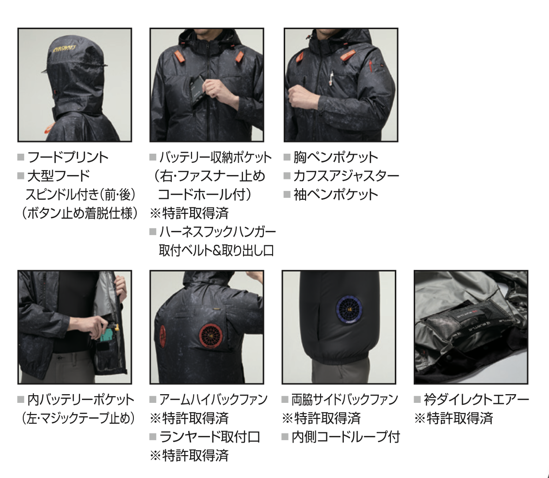 ★ヘルメット収納フード(着脱可能)、フックハンガー、背ランヤードホールを配備しフルハーネスに完全対応