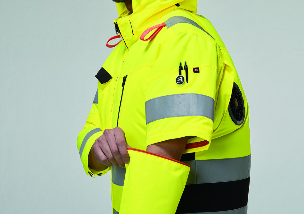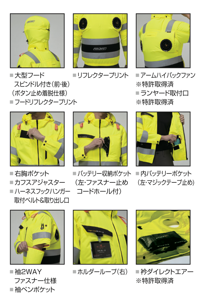 ★ヘルメット収納フード(着脱可能)、フックハンガー、背ランヤードホールを配備しフルハーネスに完全対応