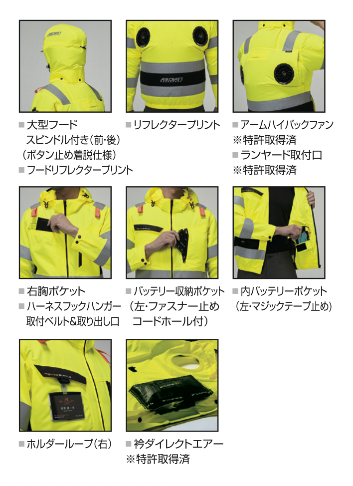 ★ヘルメット収納フード(着脱可能)、フックハンガー、背ランヤードホールを配備しフルハーネスに完全対応