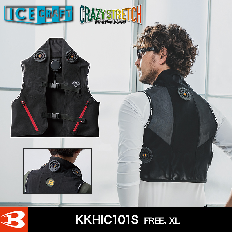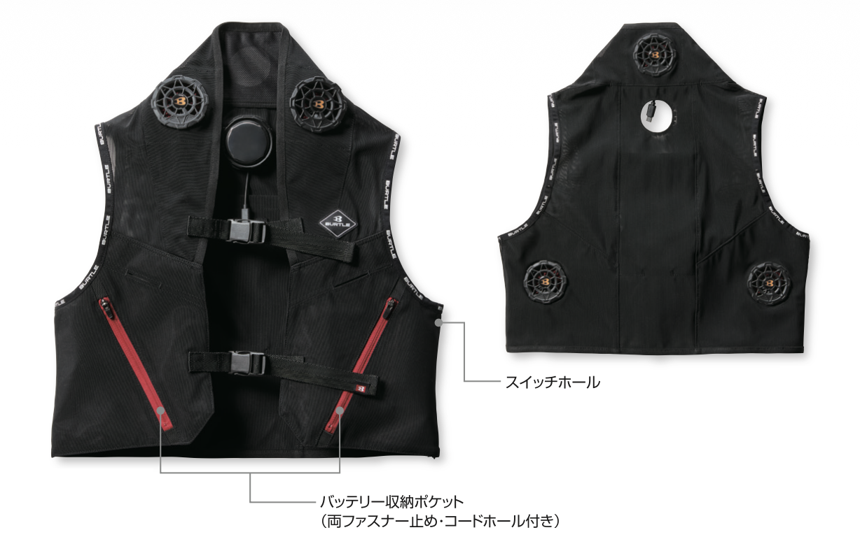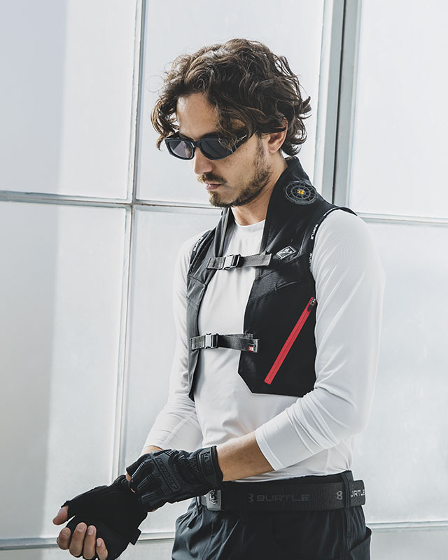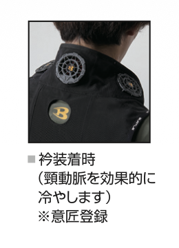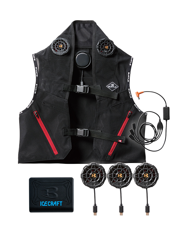身体を効果的にクールダウンさせるペルチェファンユニットを装着するアイスクラフトベスト